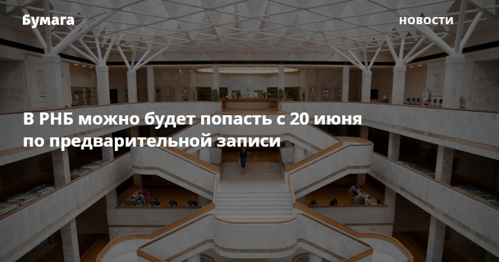 Петербургская Российская национальная библиотека 20 июня возобновит прием посетителей по предварительной записи. Об этом сообщили на сайте учреждения.
