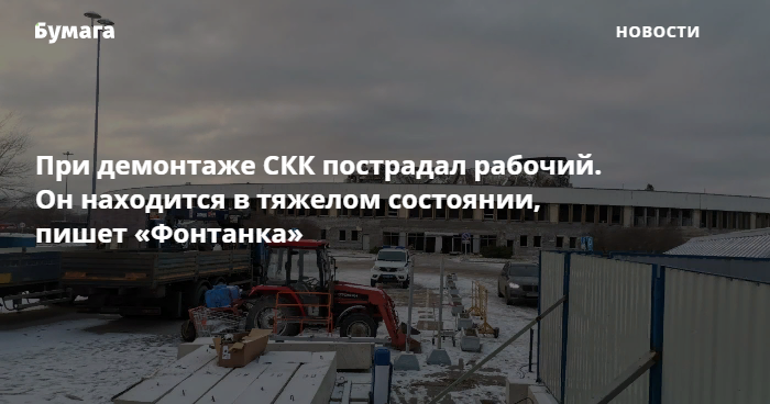 Вечером 11 июня во время демонтажных работ на стройплощадке обвалившегося СКК «Петербургский» пострадал рабочий. Об этом сообщила «Фонтанка» со ссылкой на директора компании-генподрядчика работ «Прайд» Антона Шевченко. Факт происшествия подтвердили «Бумаге» в пресс-службе концессионера комплекса «СКА Арена».