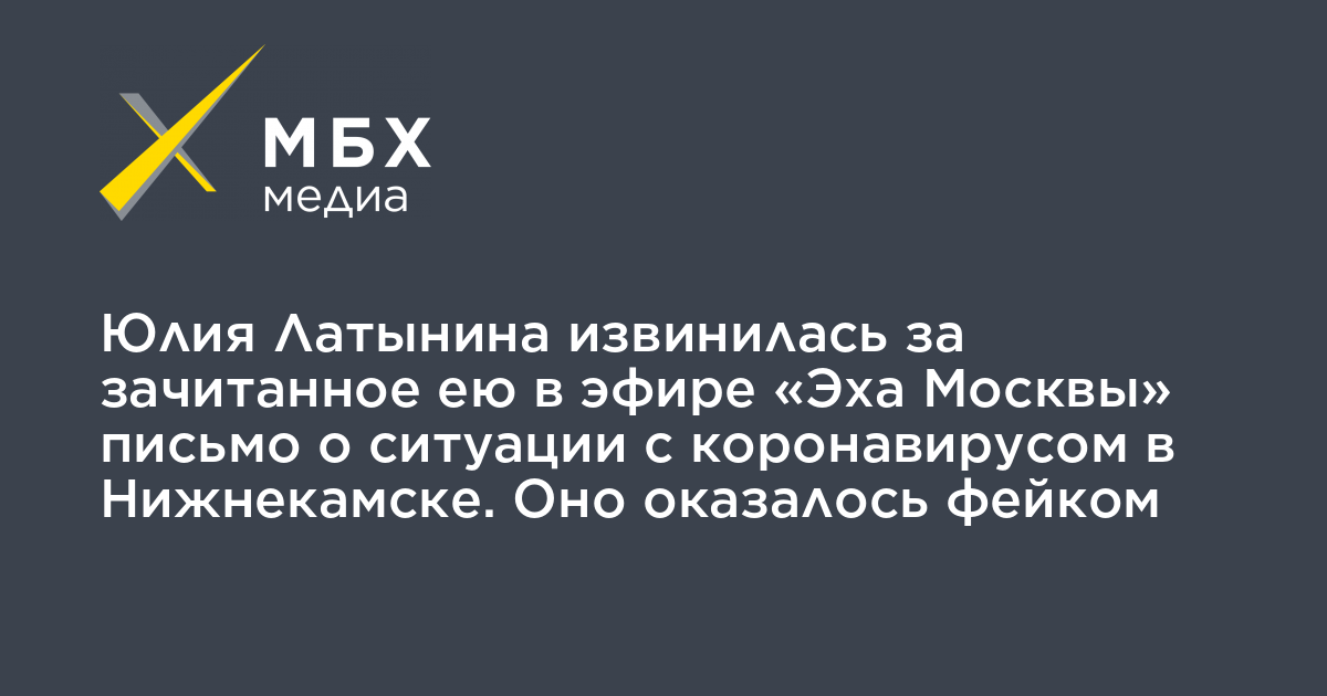 Обозреватель «Эха Москвы» и «Новой газеты» Юлия Латынина принесла извинения за зачитанное ею в эфире радиостанции письмо о ситуации с коронавирусом в Нижнекамске Республики Татарстан и признала его фейком.