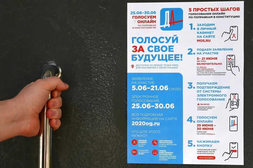 Или же, казалось бы, информационное объявление с перечислением способов голосования, где сверху нарисована галочка, а на ней написано «ДА!» и адрес сайта 2020og.ru, который является официальной площадкой для электронного голосования. Шрифты и цвета на этих листовках выполнены в похожей стилистике, как и на листовках, на которых обычно рекламируется сайт Госуслуг.