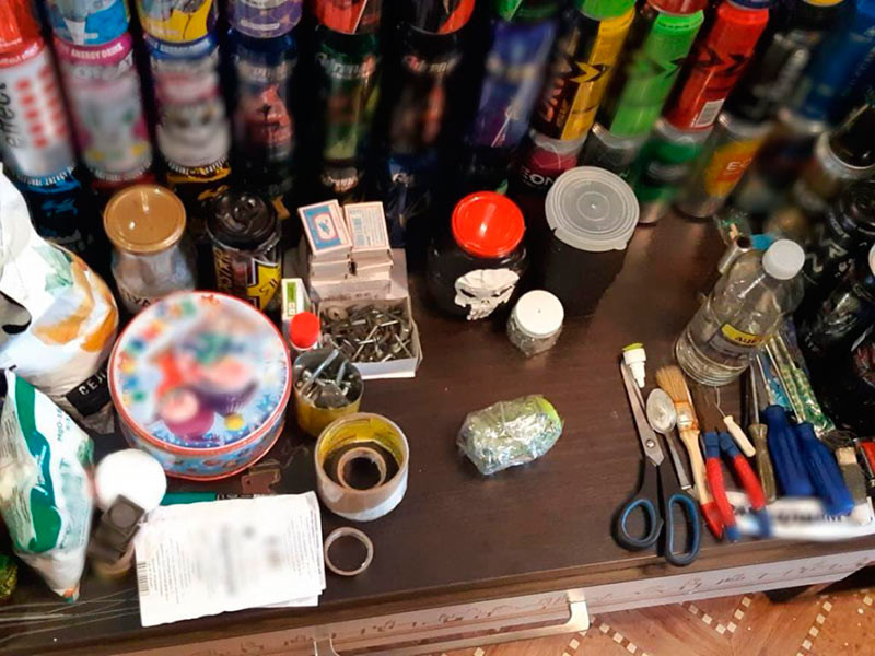 В ходе осмотра его квартиры были обнаружены готовые бомбы и бутылки с зажигательной смесью, компоненты для взрывчатых веществ, холодное оружие и рукописные инструкции по изготовлению бомб. В них также объяснялось, как совершить вооруженное нападение на школу.