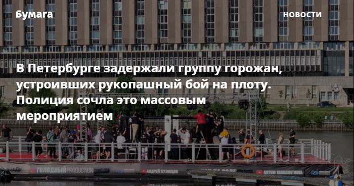 Вечером 14 июня полиция Петербурга задержала на территории Галерной гавани в Шкиперском протоке группу горожан, которые инсценировали рукопашный бой на плоту. Об этом «Бумаге» рассказали в пресс-службе регионального МВД.