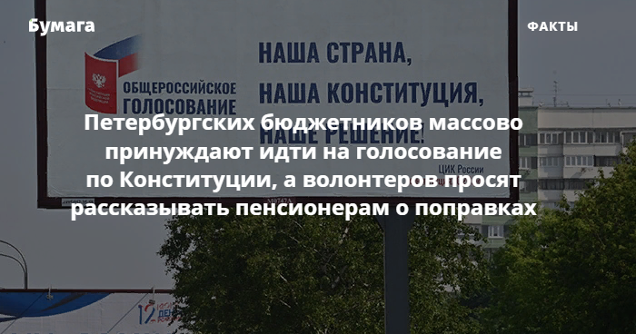 Сотрудники государственных учреждений Петербурга массово сообщают о принуждении участвовать в голосовании по поправкам в Конституцию. В большинстве случаев от работников требуют прикрепиться к конкретному участку и проголосовать там 25 или 26 июня (неважно, «за» или «против»).