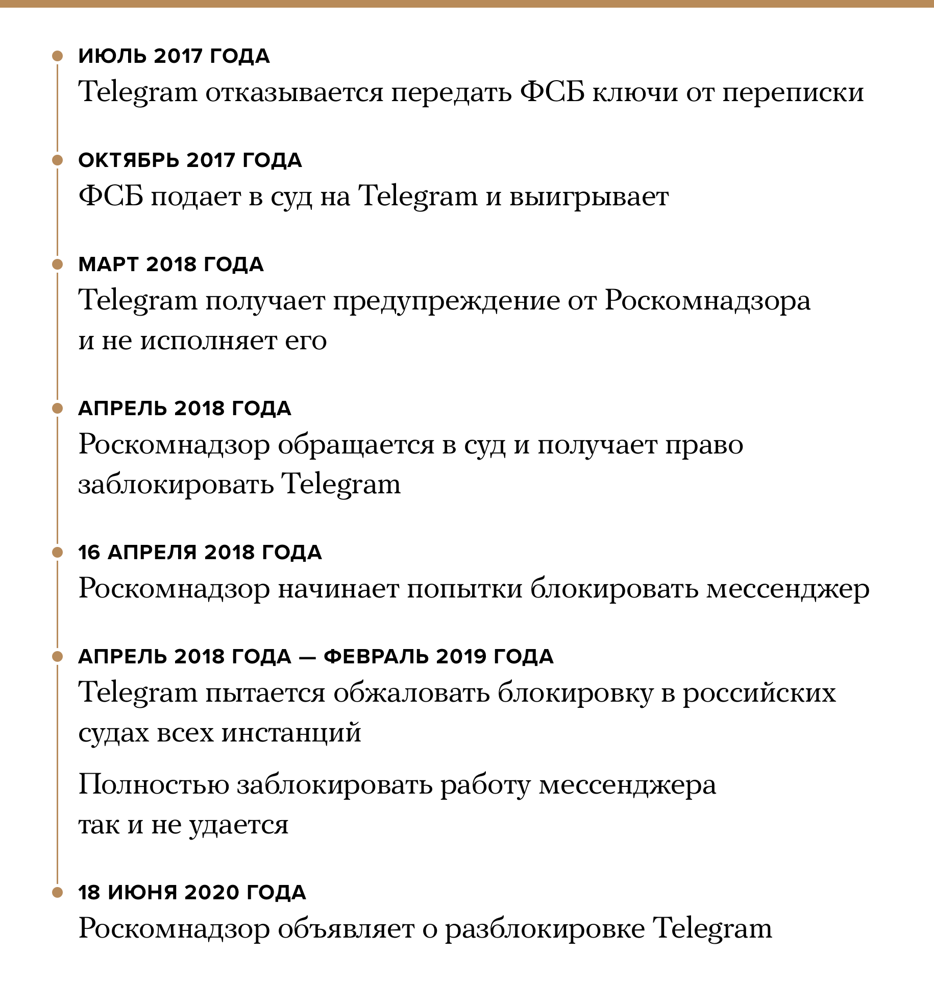 Роскомнадзор 18 июня объявил, что по согласованию с Генпрокуратурой снимает требование о блокировке Telegram на территории России. Ведомство отметило, что «позитивно оценивает» готовность Павла Дурова «противодействовать терроризму и экстремизму». Telegram в России был заблокирован по решению суда в апреле 2018 года, однако фактически мессенджер все это время продолжал работу. За время блокировки многие политики и ведомства стали пользоваться мессенджером для публикации официальной информации.