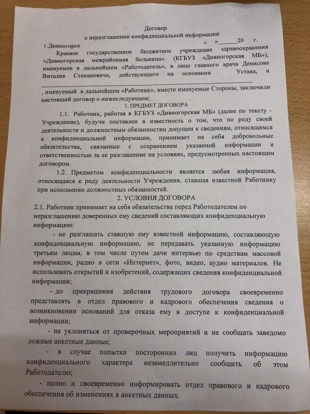 Руководство Дивногорской межрайонной больницы Красноярского края потребовало от сотрудников подписать договор о неразглашении сведений о своей работе. Ранее они жаловались на отсутствие стимулирующих выплат. Учреждение возглавляет член политсовета местного отделения «Единой России», бывший министр здравоохранения региона.