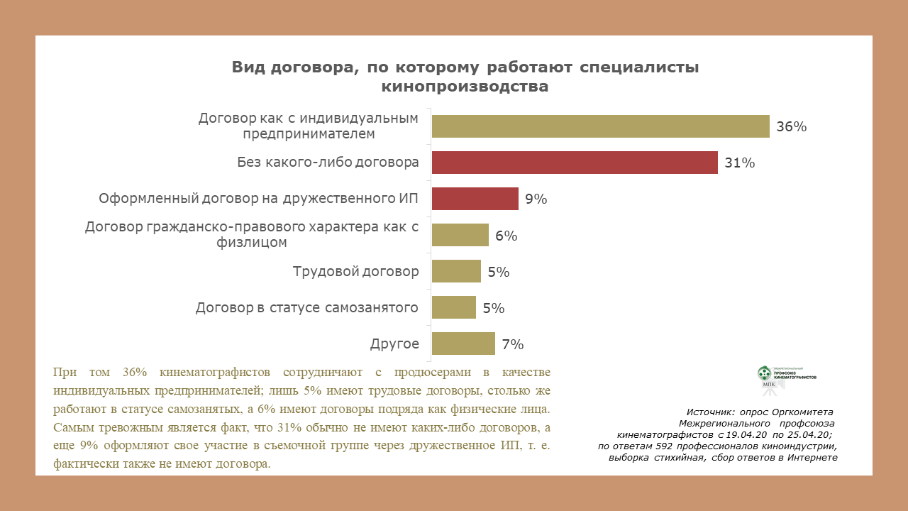 В апреле оргкомитет Межрегионального профсоюза кинематографистов провел еще один опрос, в ходе которого выяснилось, что лишь 5% специалистов кинопроизводства работают по трудовому договору. 31% работает вообще без какого-либо оформления, и самая большая доля — 36% — имеют статус индивидуального предпринимателя.