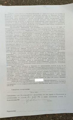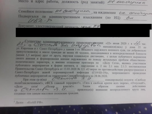 16:40 На задержанных в ОП № 78 полицейские составляют протоколы по статье о нарушении самоизоляции (ст. 8.6.1 КоАП Петербурга). Об этом ОВД-Инфо сообщила задержанная Яна Сахипова.