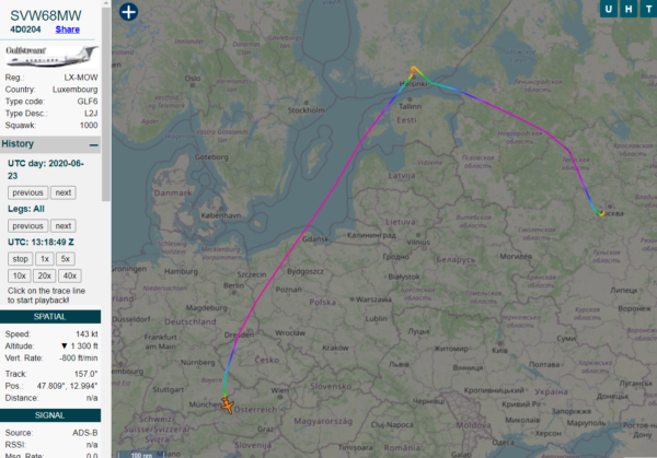 16 мая самолет с бортовым номером LX-MOW уже летал в Зальцбург, несмотря на запрет на авиасообщение с Россией. Позже власти Австрии объяснили, что для бизнес-джета было сделано исключение, поскольку он прибыл без пассажиров, чтобы «забрать чемоданы и другие вещи граждан, являющихся домовладельцами в Австрии».