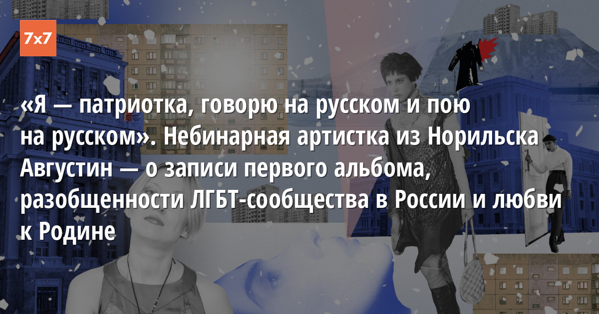 23-летняя небинарная певица Августин (с ударением на первый слог) из Норильска в конце апреля 2020 года выпустила свой первый клип "Папа Север", который за четыре дня набрал 10 тыс. просмотров в соцсетях, а о ее творчестве рассказали крупные российские и мировые СМИ. Деньги на съемки собрали благодаря краудфандинговой кампании квир-журнала "Открытые". Сейчас она записывает первый альбом. Интернет-журнал "7х7" рассказывает, как Августин увлеклась музыкой, почему не хочет уезжать из России и почему россияне по отношению к ЛГБТ-персонам "колеблются от всеобщей открытости и отзывчивости до закрытости".
