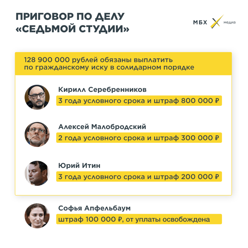 Также суд взыскал с Серебренникова, Итина, Малобродского 129 млн рублей по иску Минкультуры.