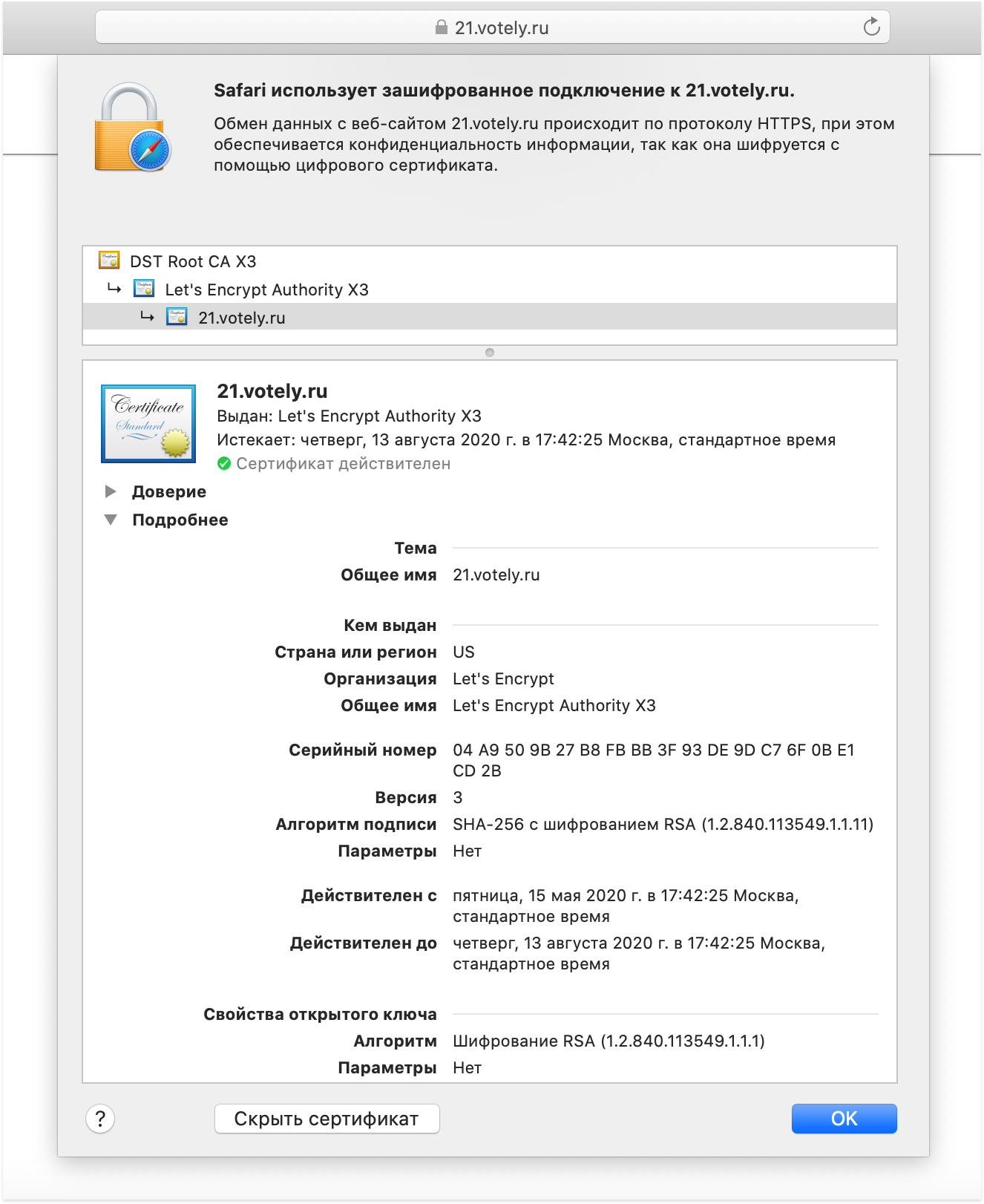 Еще один факт, указывающий на связь Votely с госструктурами: при попытке открыть ссылку вида https://21.votely.ru:2963/ у пользователя появляется страница с надписью «Доступ запрещен» («403 Forbidden»). Однако на этой странице есть действующий TLS-сертификат, выданный центром сертификации Letʼs Encrypt. Установить TLS-сертификат невозможно, не имея доступа к серверу или компьютеру, на котором расположен сайт, — в данном примере — серверу, расположенному в сети Министерства цифрового развития Чувашии. «Медуза» ранее подробно рассказывала о том, зачем нужны цифровые сертификаты на сайтах и как они работают.