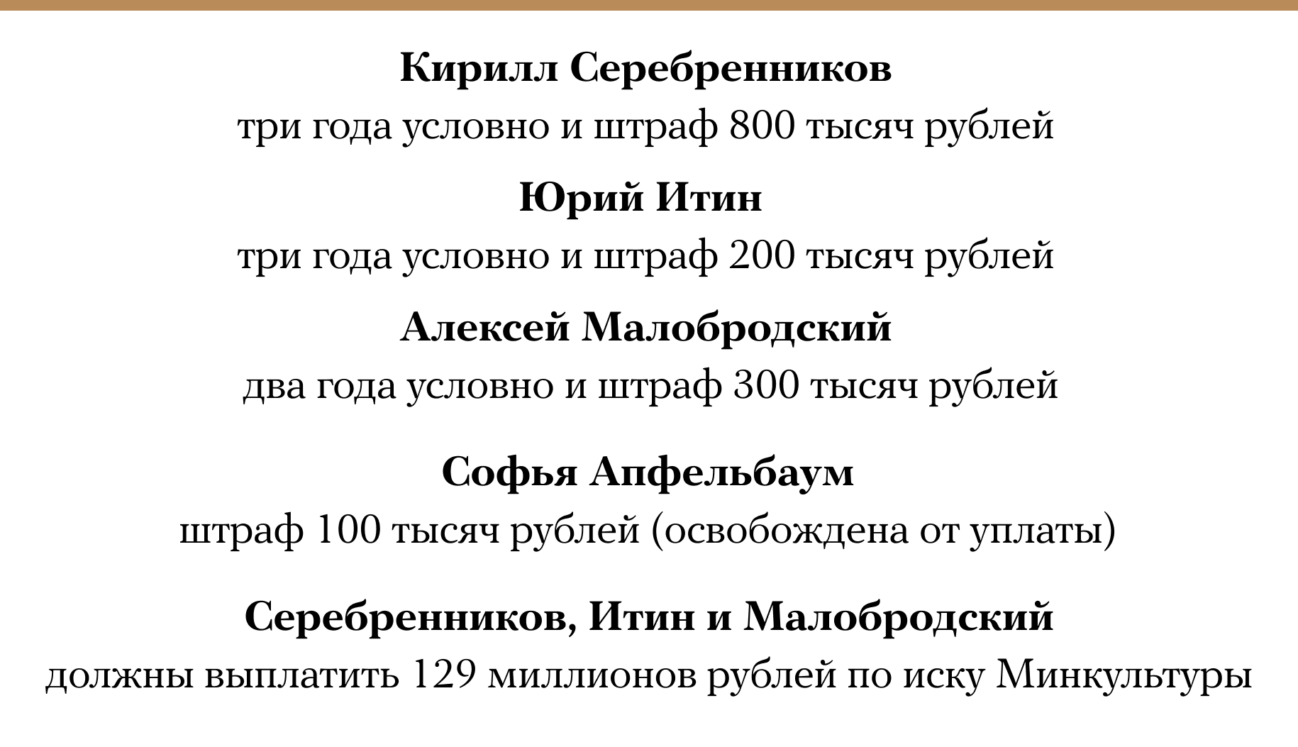 Мещанский суд Москвы 26 июня приговорил режиссера, художественного руководителя «Гоголь-центра» Кирилла Серебренникова к трем годам условно по делу «Седьмой студии». Его признали виновным в хищении 129 миллионов рублей, выделенных министерством культуры на театральный проект «Платформа». Еще двое фигурантов дела — бывший гендиректор «Седьмой студии» Юрий Итин и бывший генеральный продюсер организации Алексей Малобродский — также приговорены к условным срокам. Их признали виновными в мошенничестве. Бывшая сотрудница Минкульта, директор российского академического Молодежного театра Софья Апфельбаум приговорена к штрафу по обвинению в халатности, ее освободили от наказания в связи с истечением срока давности.