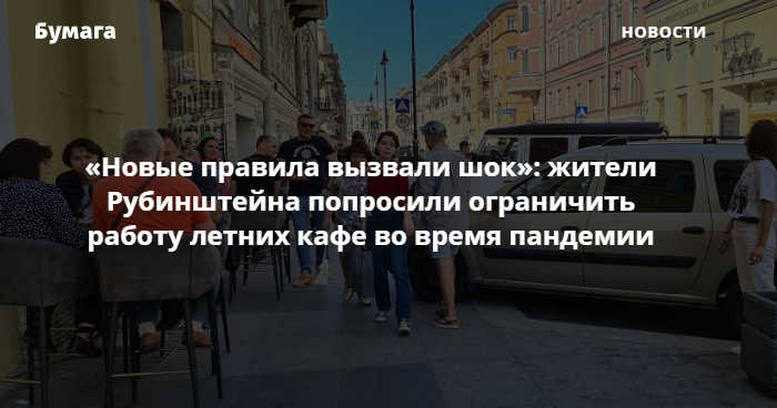 Общественная организация «Граждане улицы Рубинштейна» обратилась с открытым письмом к губернатору Александру Беглову и главному санитарному врачу Петербурга Наталье Башкетовой. Это произошло после того, как власти пообещали в упрощенном режиме выдавать рестораторам разрешение на размещение веранд из-за ситуации с пандемией.