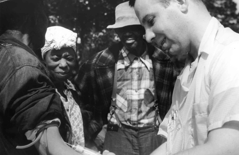 Врач вводит вакцину одному из испытуемых в ходе эксперимента 1932–1972 годов в г. Таскиги, штат Алабама, США.