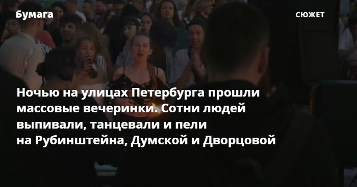 В ночь на субботу на Рубинштейна, Думской и Дворцовой прошли массовые уличные вечеринки. Сотни людей танцевали, пели и выпивали. На Рубинштейна, по словам очевидцев, полиция задержала нескольких человек. Ранее на шум и работу баров жаловались местные жители.