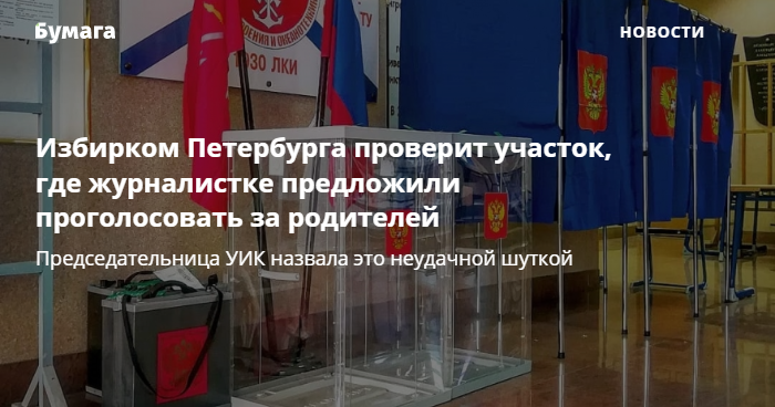 Избирательная комиссия Петербурга начала проверку в отношении председателя УИК № 398 в Учебном переулке, на котором главному редактору «Нового проспекта» Анне Невской предложили проголосовать за родителей. Об этом заявил замначальника Управления организации и правового обеспечения избирательного процесса Григорий Марголин.