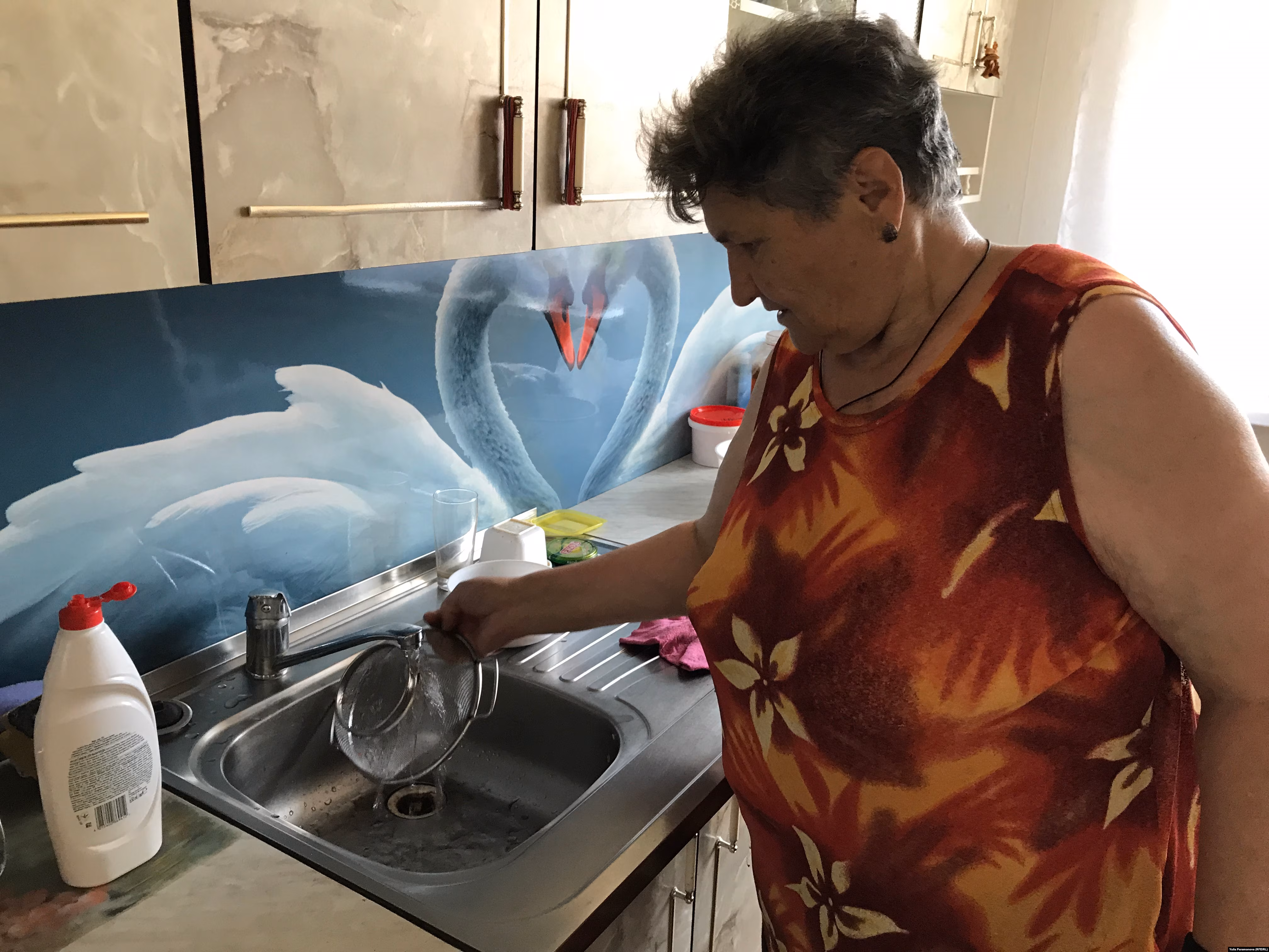 – Я в 1994 году приехала сюда, и вода была намного лучше, не была такой вонючей и грязной. Сейчас цвет воды желтый от ржавчины. Она чисто техническая, мы ее не пьем – ведь это можно умереть сразу. Воду берем в магазине. А эту воду стараемся по ночам набирать для туалета, постирать что-то темное. Стиральные машинки ломаются, все шланги забиты ржавчиной, – говорит Александра Холова.