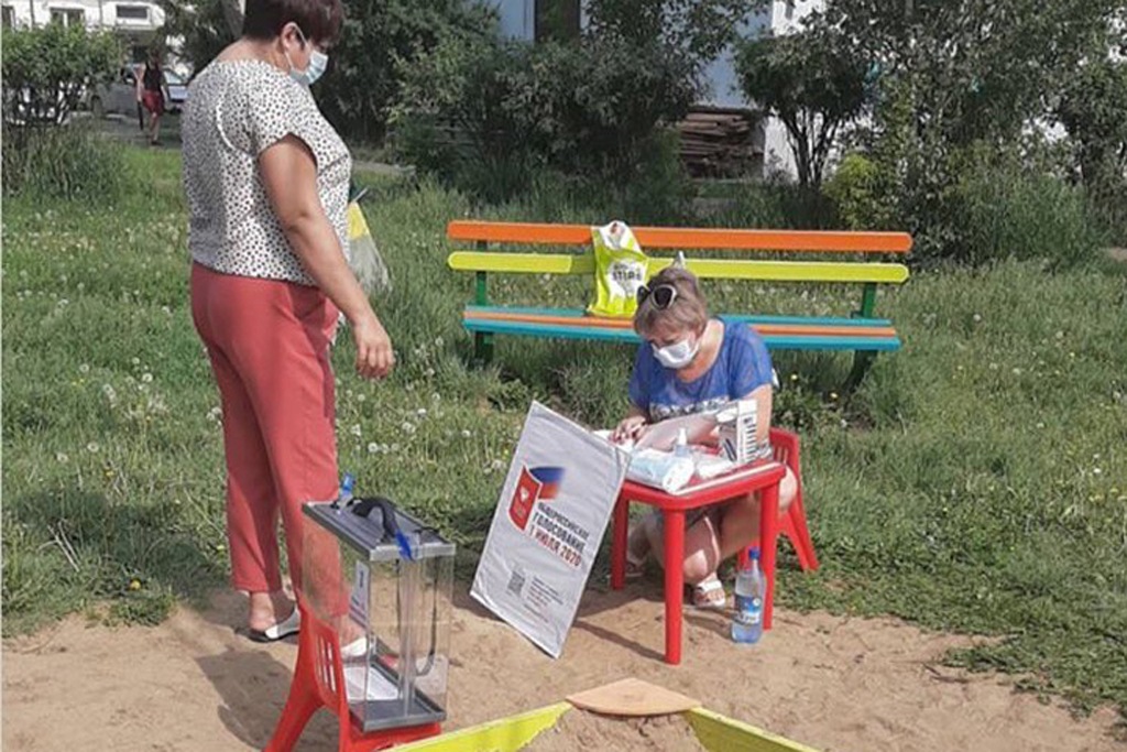 13:21 Избирком Забайкалья отрицает информацию о забытой в одном из дворов Читы урне для голосования по поправкам в Конституцию. Чиновники уверяют, что ни полицейский, ни наблюдатели, ни члены УИК просто не попали в кадр, потому что общались с людьми на детской площадке, сообщили в пресс-службе избиркома. Фото урны было опубликовано порталом «Заб.ру» 27 июня.