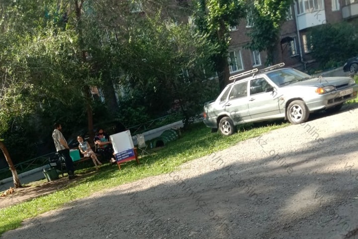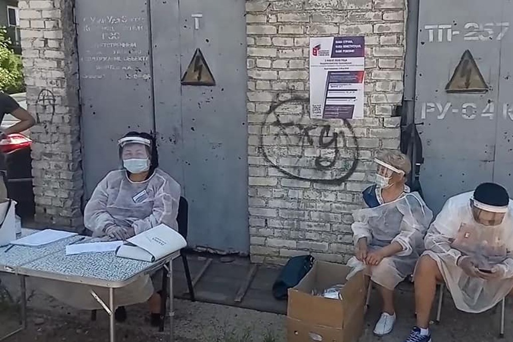 «Именно так выглядит одно из мест для голосования по поправкам в конституцию, — говорится в сообществе „Новокузнецк онлайн“ во „ВКонтакте“ — Улица Горьковская, 36. Люди разместились и предлагали проголосовать всем мимо проходящим».