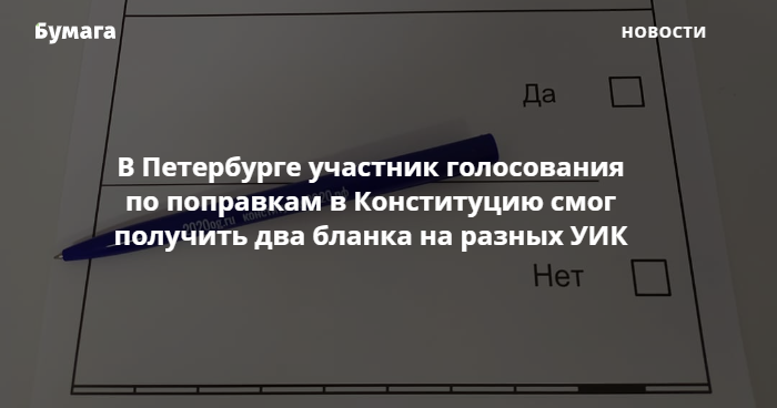 Петербуржец Александр Федосеев на голосовании по поправкам в Конституцию смог получить два бюллетеня на участках в разных районах города. Об этом мужчина рассказал в социальных сетях.