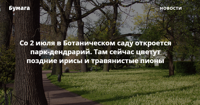 Со 2 июля в Ботаническом саду Петра Великого в тестовом режиме начнет работать парк-дендрарий. Об этом «Бумаге» сообщили в пресс-службе Ботсада.
