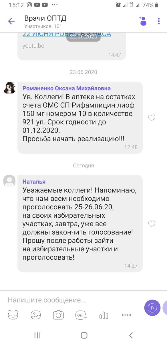 Та же ситуация сложилась в Тюменском областном противотуберкулезном диспансере, где, по данным заявителя, главный врач – Пирогова Наталья Давыдовна – настаивает на досрочном голосовании всех сотрудников. В качестве доказательства автор приводит скриншот переписки в рабочем чате медучреждения.
