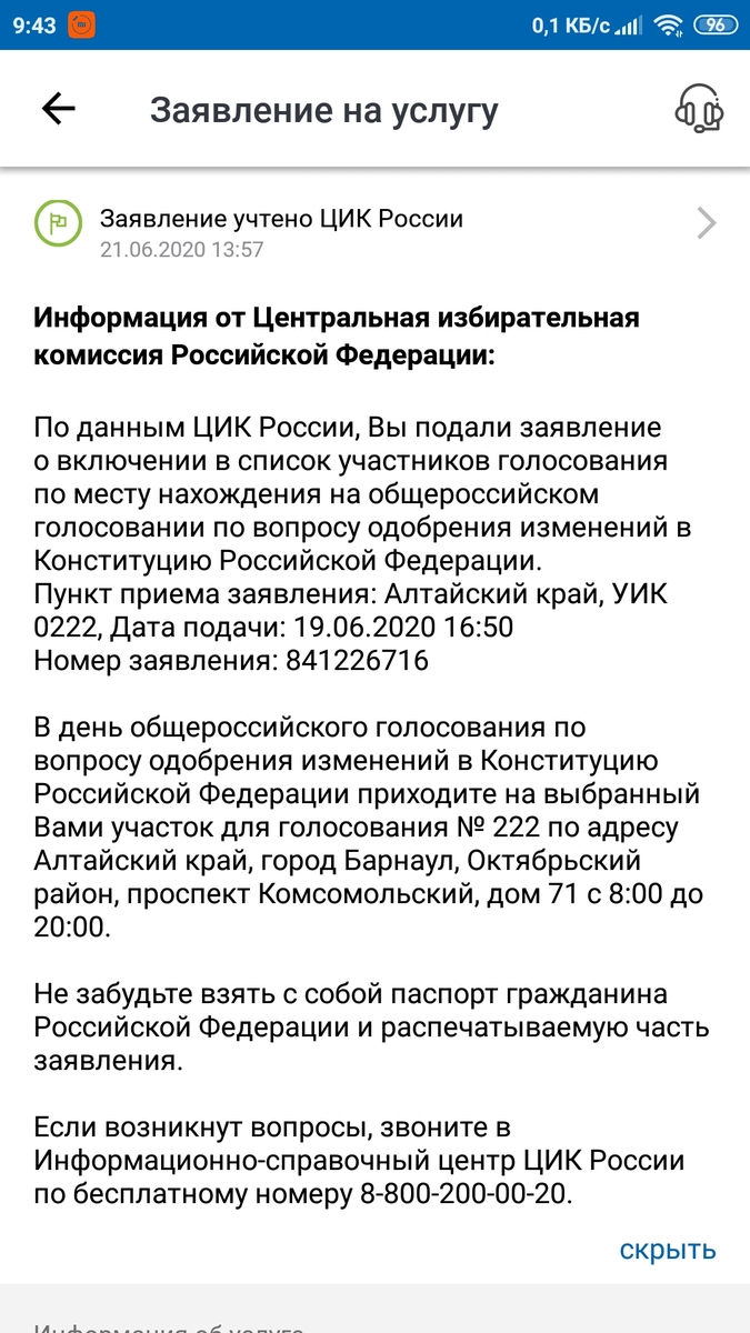 Житель Барнаула сообщил на карту нарушений, что он получил официальное оповещение от ЦИК о смене участка голосования – якобы в соответствии с его просьбой. Притом что он ни о чем подобном не просил и заявления не подавал. "Было подано заявление в ЦИК и мне сменили участок для голосования с 208 на 222", – сообщил избиратель, прикрепив скриншоты экрана телефона с уведомлением от ЦИК.