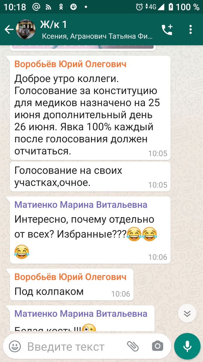По словам акушерки, старшая медсестра консультации также агитировала её участвовать в голосовании 25 июня 2020 и сказала автору открепиться на портале госуслуг от своей УИК по месту регистрации. "Город Колпашево у меня, а прикрепиться сказала к одной из томских УИК по месту фактического проживания, – поясняет автор обращения. – Также акушерка включала аудиозапись сообщения главной медсестры роддома Моисеевой Анжелики Викторовны, которая командным тоном заявила: "Пусть перекрепляются, и ВСЕ идут на голосование!! Также Мамай (акушерка) мне сказала: "Проголосовать 25 июня и скинуть ей в личку (в Вотсапе) сообщение: "Я проголосовала". Затем они с заведующим Воробьёвым будут собирать сведения о проголосовавших и передадут главному врачу роддома Агарковой Елене Юрьевне". Автор прикрепила также скрин переписки в рабочем чате.