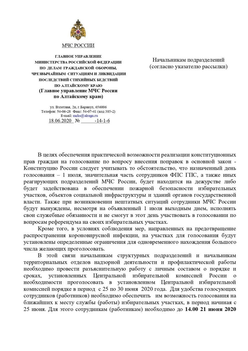 – Людей заставляют написать заявление о голосовании по месту нахождения (то есть работы). В список проголосовавших попадают не только сами сотрудники, но и члены их семей. Контроль ведется пофамильно с привязкой к УИК – в качестве доказательства авторы жалоб прислали внутреннее распоряжение начальника управления кадровой работы краевого МЧС, адресованное начальникам подразделений с требованием предоставить сведения о личном составе, заявившем о голосовании по месту нахождения и участвовавшем в голосовании ранее (25 и 26 июня). При этом сведения предполагается собирать не только о сотрудниках МЧС, но и членах их семей.