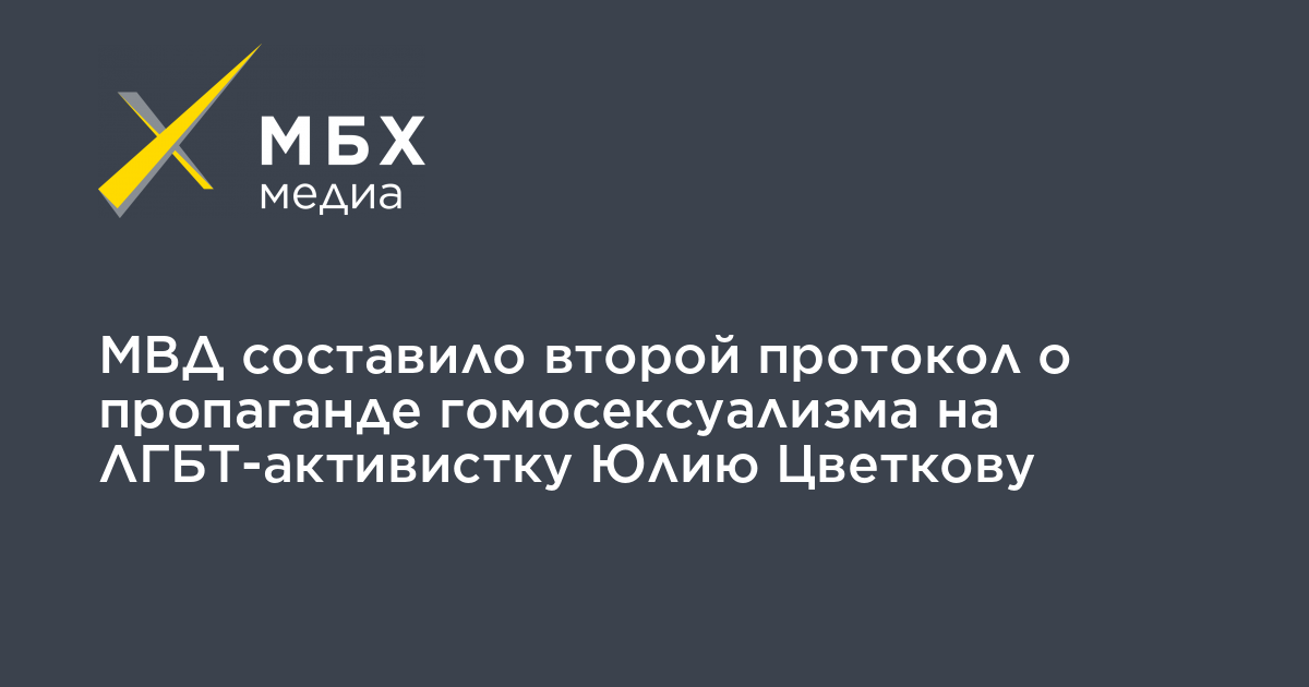 МВД составило второй административный протокол о пропаганде гомосексуализма среди несовершеннолетних на ЛГБТ-активистку Юлию Цветкову из-за картинки во «ВКонтакте» с надписью «Семья там, где любовь. Поддержите ЛГБТ+ семьи». Об этом Цветкова сообщила «МБХ медиа».