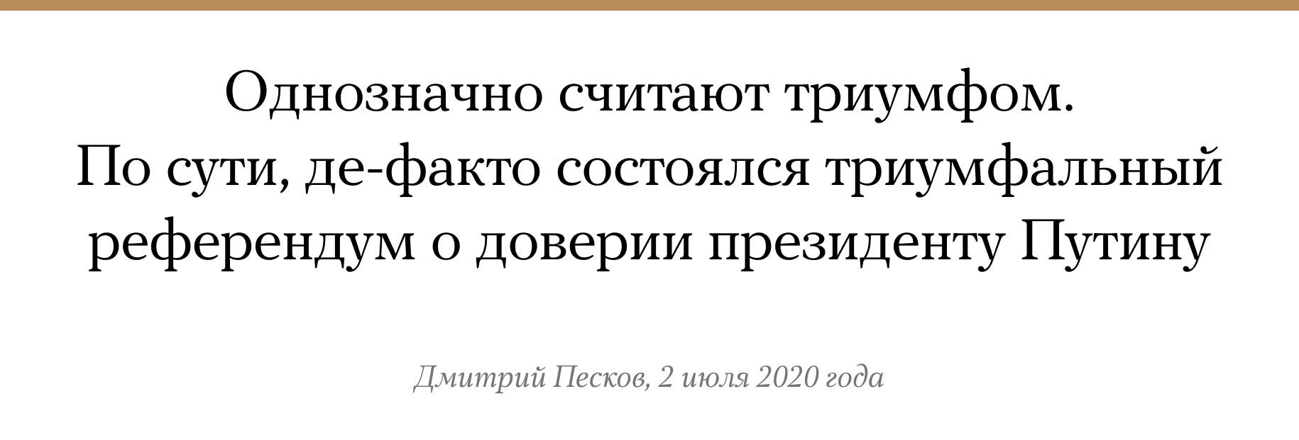 В России прошло голосование по поправкам к Конституции, среди которых обнуление президентских сроков, позволяющее Владимиру Путину вновь баллотироваться на пост главы государства. По данным ЦИК, поправки поддержали почти 78% проголосовавших, явка была около 65%. Дмитрий Песков, отвечая на вопрос журналистов, как в Кремле оценивают результаты голосования, назвал их триумфом. «Легко прогнозировался высокий интерес к теме поправок, — заявил Песков. — Но, конечно, такую высочайшую явку и высочайший уровень поддержки, который на сегодняшний день уже отфиксирован, было спрогнозировать очень сложно».