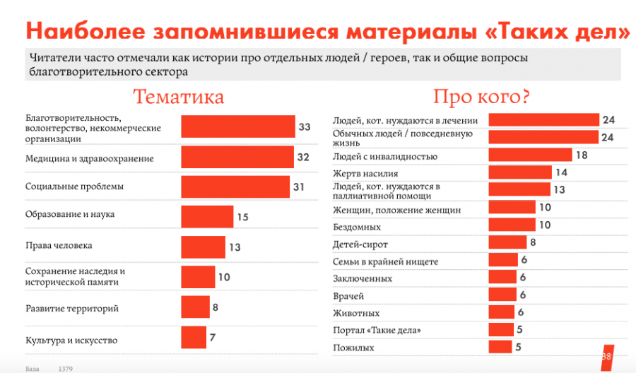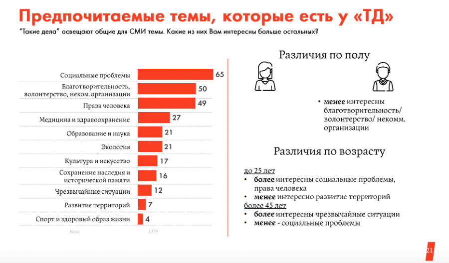 Больше всего аудитория «Таких дел» любит читать истории людей, портреты и репортажи. Им интересны тексты про социальные проблемы (65%), благотворительность (50%) и права человека (49%). При этом присутствует дифференциация по возрасту: людям до 25 лет интереснее читать про социальные проблемы и права человека, а людям старше 45 лет — новости и тексты про чрезвычайные ситуации.