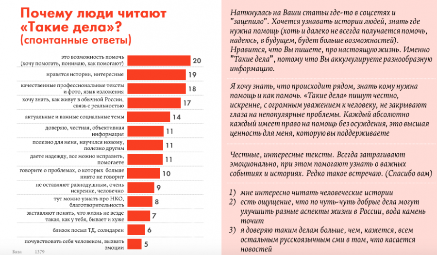Скриншот из отчета по исследованию Журналисты «Таких дел», по мнению читателей, «помогают развивать благотворительность в России» (74%), «поднимают проблемы и темы, о которых молчат другие» (74%), «видно, что им не все равно»/«работают с душой» (68%), «реально помогают тем, кто нуждается в помощи» (68%).