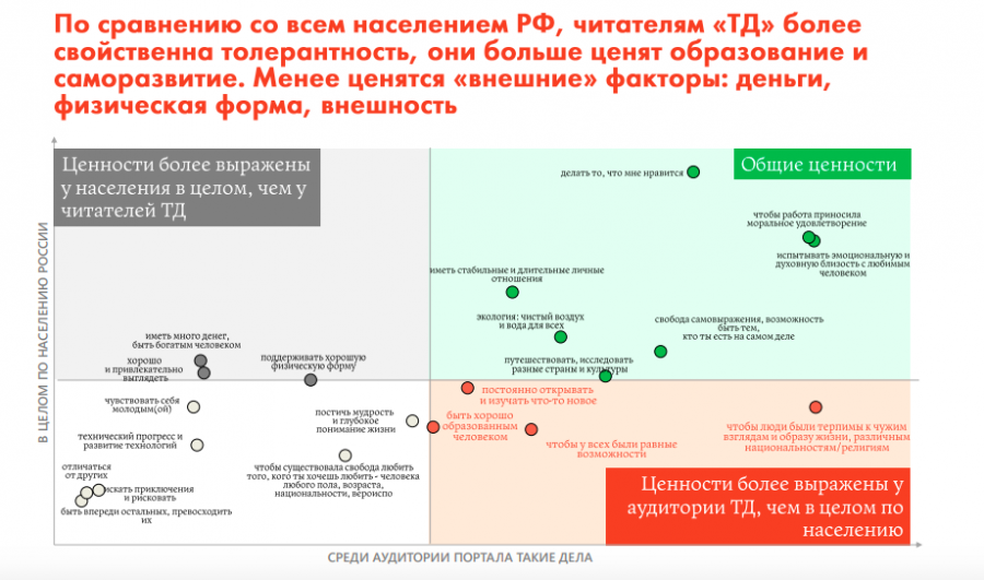 Ответы респондентов исследователи сравнивали со среднестатистическими ответами по итогам нескольких всероссийских опросов. Читатели «Таких дел» отличаются большей толерантностью, а также стремлением к самообразованию и развитию. Аудитории портала важно, «чтобы люди были терпимы к чужим взглядам и образу жизни, различным национальностям/религиям», «чтобы у всех были равные возможности», «постоянно открывать и изучать что-то новое», «быть хорошо образованным человеком». Таким устремлениям, как «иметь много денег, быть богатым человеком», «хорошо и привлекательно выглядеть», «иметь хорошую физическую форму», читатели придают меньше значения.