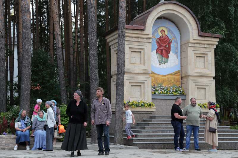 Среднеуральский женский монастырь «Спорительница хлебов»Фото: Владислав Лоншаков/Коммерсантъ Внутри храма — под сотню человек, в основном монахини, но и несколько казаков, отбивающих после крестного знамения поясной поклон полностью, касаясь пальцами земли. Служит вечерню не Сергий, а прикрепленные к монастырю иеромонах Иоанн (Иванов) и иерей Сергий Берестов. Очередь на елеепомазание выстраивается вдоль двух икон и раки с мощами, и каждый в очереди прикладывается, оставляя на защитных экранах разводы от губ.