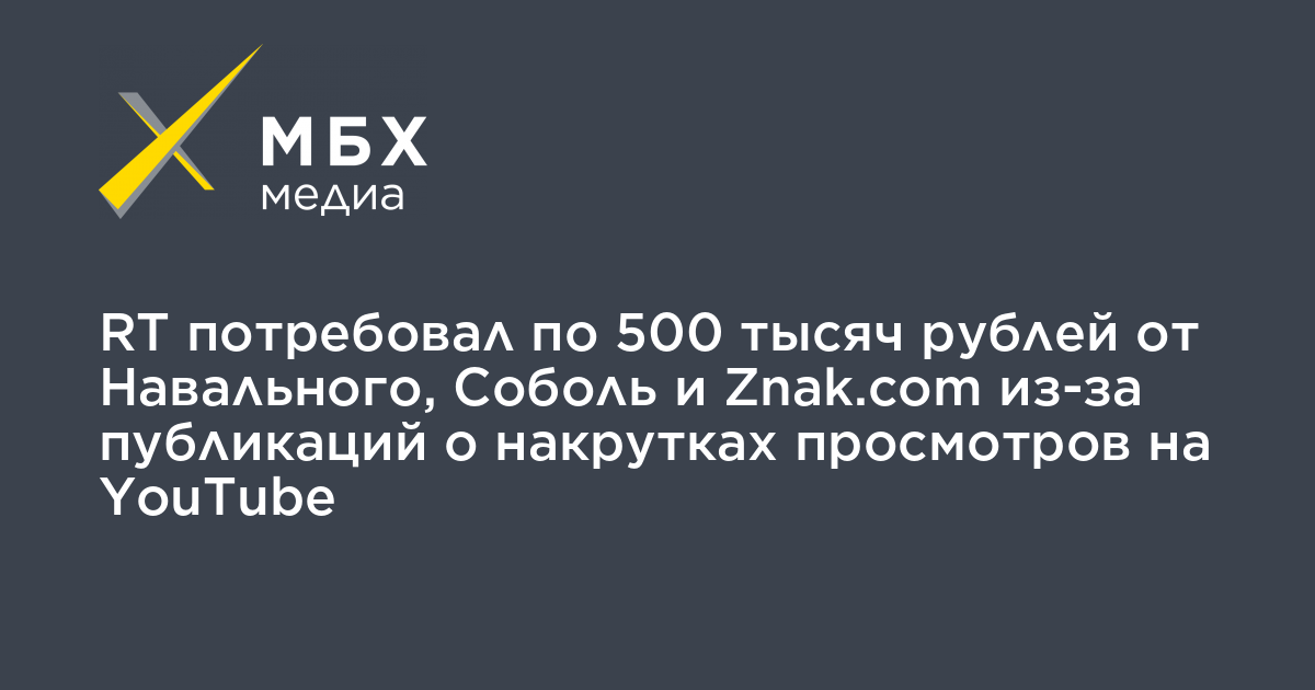 RT потребовал по 500 тысяч рублей от Навального, Соболь и Znak.com из-за публикаций о накрутках просмотров на YouTube