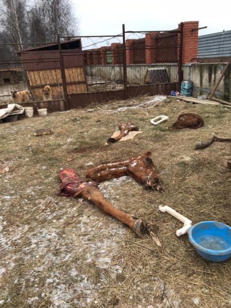 Кроме собак, за забором лежат в грязи несколько десятков свиней и, как говорят волонтеры и жители деревни, бог знает сколько трупов разных животных, преимущественно лошадей. Запах, исходящий от владений Реуцкого, вызывает рвотные позывы. Волонтеры, видя такую реакцию, только усмехаются — они ездят сюда не первый год и давно к такому привыкли.