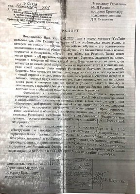 Адвокат также публикует рапорт, ставший поводом для задержания Гяммера. Полицейские проводят проверку по административной статье о неуважении к власти (ч. 3 ст. 20.1 КоАП).