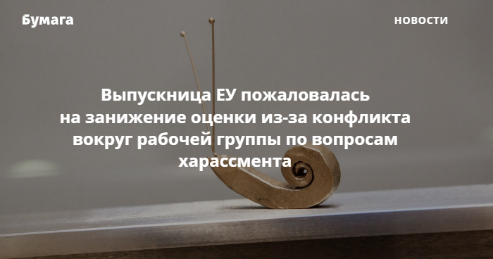 Выпускница Европейского университета в Петербурге Александра Воронина пожаловалась на занижение оценки за свою магистерскую диссертацию. На странице в фейсбуке девушка написала, что ей поставили отметку «хорошо» вместо «отлично» из-за конфликта вокруг рабочей группы по вопросам харассмента.