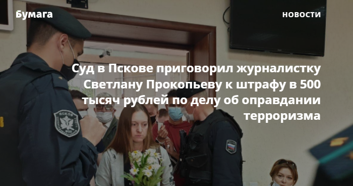 Псковский гарнизонный военный суд признал журналистку Светлану Прокопьеву виновной в оправдании терроризма и назначил штраф в размере 500 тысяч рублей. Об этом сообщает «Медуза».