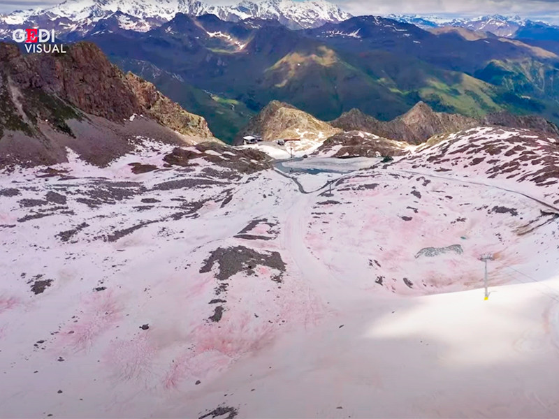 В итальянских Альпах наблюдается удивительное для этих мест явление. В некоторых районах (например, на леднике перевала Гавия на высоте 2618 метров над уровнем моря и частично на леднике Презена) снег стал розовым. В окрашивании виновата водоросль Ancylonema nordenskioeldii. Этот вид никогда ранее не был количественно задокументирован в Альпах, он доминирует в цветении водорослей на ледяном покрове Гренландии, отмечается в статье итальянских ученых в журнале Scientific Reports.