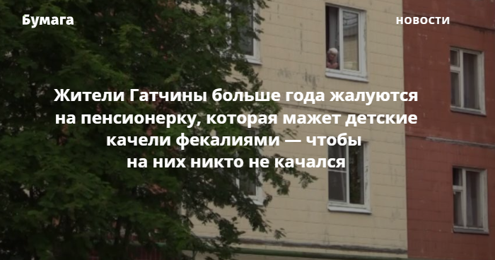 Как очевидцы рассказали «Гатчинской службе новостей», раньше пенсионерка просто кричала из окна, если кто-то из детей подходил к качелям и требовала, чтобы они не качались. Около года назад она начала обмазывать качели экскрементами. Иногда она замахивается на детей палкой или лопатой, отмечают жители.