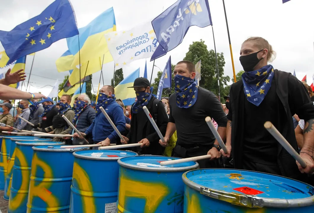Значительная часть людей на митинге были в масках: карантин никто не отменял. О дистанции же говорить не имело смысла. Стояли плотно, плечом к плечу, скандируя «Порошенко — криголам!» («Криголам» по-украински значит «ледокол» — Ред.), «Порох есть — дадим огня!»