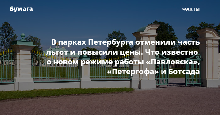 В ГМЗ «Петергоф» цены на билеты не подняли, но временно упразднили все внутренние льготы. Как «Бумаге» сообщили читатели, администрация музея-заповедника отменила бесплатный вход в парки «Александрия» и «Ораниенбаум» для местных жителей. В пресс-службе говорят, что это временная мера.