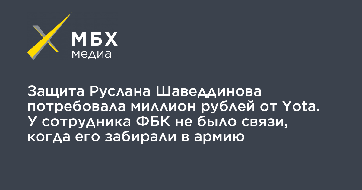 Защита сотрудника Фонда борьбы с коррупцией Руслана Шаведдинова потребовала миллион рублей компенсации от оператора Yota за неоказание услуг связи в день, когда Шаведдинова забирали в армию. Об этом сообщил «МБХ медиа» юрист ФБК Владлен Лось.