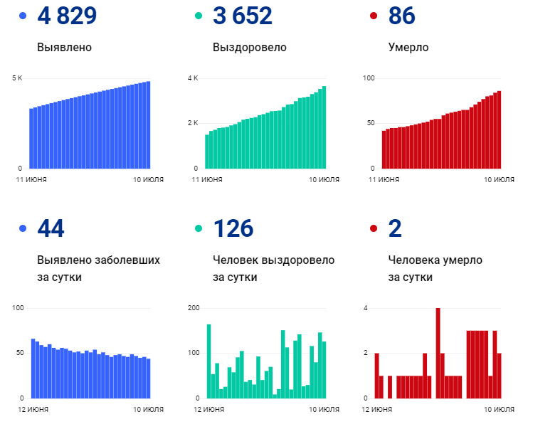 Всего в России на данный момент количество зараженных коронавирусом составляет 713 936 человек (за сутки — 6 635). Из них 489 068 человек выздоровели (за сутки — 7 752), а 11 017 человек умерли (за сутки — 174).