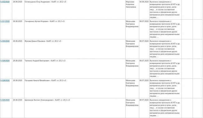 В Санкт-Петербурге 22 июня Второй Западный окружной военный суд огласил приговор фигурантам дела «Сети» Филинкову и Бояршинову. После суда силовики стали задерживать людей, пришедших поддержать обвиняемых. Всего задержали 30 человек, шестерых отвезли в отдел полиции № 76. Там задержанных Артема Гончаренко, Филиппа Щелканова, Андрея Ткаченко, Никиту Погодаева, Диану Жукову, Егора Остапущенко оставили в полиции на ночь с протоколами по 5-й части статьи 20.2 (нарушение порядка проведения публичного мероприятия) и статье 19.3 (неповиновение законным требованиям сотрудников полиции) КоАП. Суд вернул именно их материалы дела.