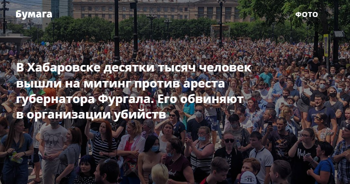 Утром 11 июля в Хабаровске и и других городах Хабаровского края десятки тысяч человек вышли на несогласованный митинг против ареста губернатора Сергея Фургала, обвиняемого в организации убийств бизнесменов. Они требовали расследования дела в Хабаровске и отставки президента Владимира Путина.