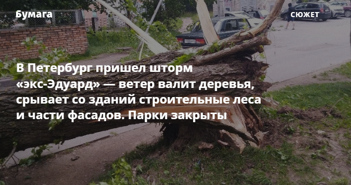 Вечером 11 июля в Петербург пришел внетропический шторм, который синоптики называют «экс-Эдуард». Петербуржцы сообщают о рухнувших из-за сильных порывов ветра деревьях и светофорах, сорвавшихся с высоты кусках фасадов и падении строительных лесов. Из-за угрозы для горожан Смольный закрыл парки и скверы, а из-за увеличения уровня воды дирекция комплекса защитных сооружений частично закрыла дамбу.