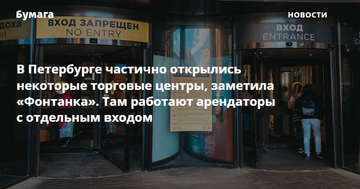 Согласно постановлению № 121 об ограничениях в Петербурге из-за коронавируса, в городе разрешена работа любых магазинов со входом с улицы, если они не находятся в ТЦ. Разъяснений о том, можно ли работать в ТЦ, имея отдельный вход, не было, отмечает «Фонтанка». При этом некоторые арендаторы считают, что это разрешено.